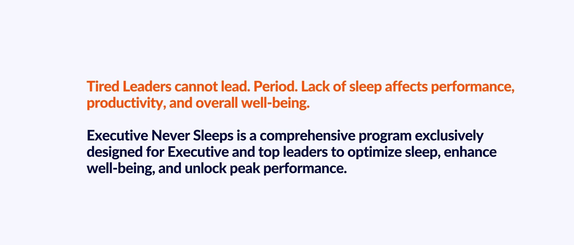 This program is specifically designed to address the unique challenges faced by Executive and top leaders in managing sleep and relaxation amidst demanding responsibilities.